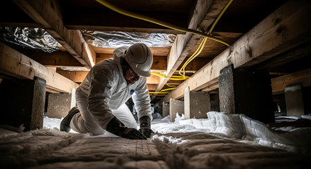 A worker dressed in a white protective suit and helmet is kneeling in a crawl space, inspecting insulation The crawl space is characterized by wooden beams and yellow cables running along the ceiling. The worker is wearing gloves and appears to be focused on their task. The setting is dimly lit, emphasizing the detailed and methodical nature of the inspection. The captures the essence of a construction or maintenance work environment, highlighting the importance of safety gear and careful...