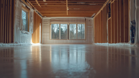 Sunlit wooden frame reveals bundles of insulation waiting to be installed, capturing the early stages of home development with natural light filling the space.
