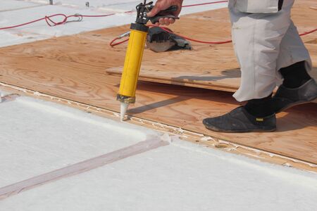 Installation of new floor of wooden natural planks and mineral wool insulation for isolation and keeping warmth. Modern technologies, warm comfortable house and eco-friendly insulation concept.