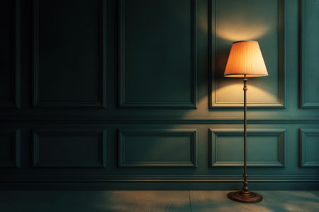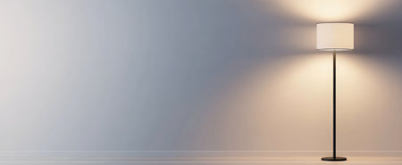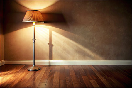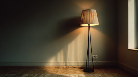 A serene floor lamp stands in an uncluttered room, illuminating the space with a warm glow, casting gentle shadows on the wooden floor, inviting relaxation and calm.