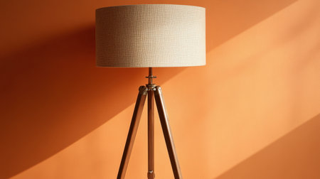 A stylish tripod floor lamp with a beige shade stands against a vibrant orange wall, creating captivating shadows and enhancing modern interior design aesthetics.