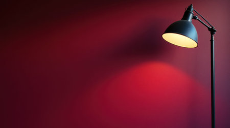 A stylish modern lamp stands against a rich red wall, casting a warm and inviting light that enhances the cozy atmosphere of the interior space.