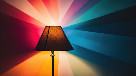 A stylish lamp stands against a wall, casting vibrant rays of color that create a stunning backdrop of light and shadow for a creative space.