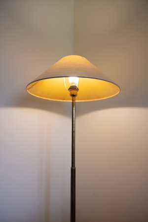 Interior with floor lamp and glow bulb in the dark at night, one lamp in the corner against a floor lamp wall.