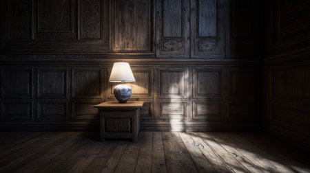 A decorative lamp sits on a small table, illuminating a portion of a room. The walls are paneled with dark wood, creating a vintage appearance. Sunlight streams through, creating a pattern. The scene is lit with warm and cool tones. It is suitable for diverse commercial applications.