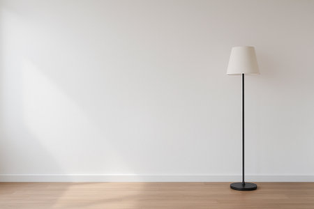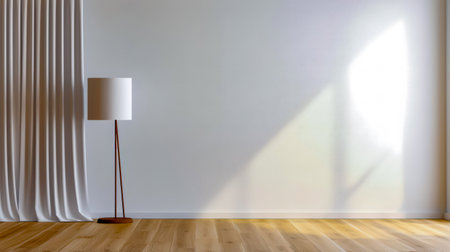 Minimalist interior design with a modern standing lamp casting a shadow on a plain white wall and a wooden floor