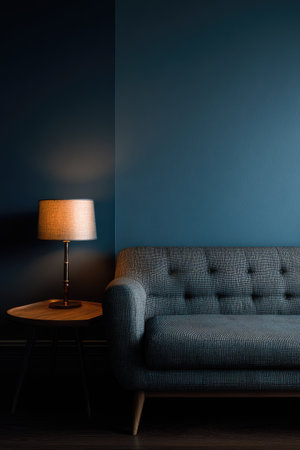 A minimalist interior showcases a sofa and a lamp against a dark blue wall. The composition highlights simple shapes and muted colors creating a sense of calm. The lighting is soft, suggesting a peaceful indoor setting suitable for various design projects and editorial content.