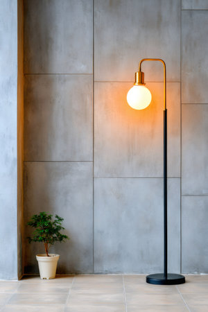 Modern floor lamp and houseplant decorating a minimalist room with a concrete tile wall