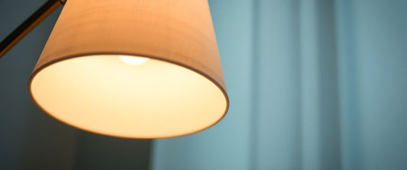 A small cozy table lamp with a simple lampshade shines with a calm diffused warm light in the evening. Minimalism and comfort in the interior. Close-up