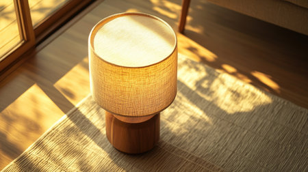 Aerial view of a lamp with a wooden base and a fabric shade, creating a warm and natural lighting effect.