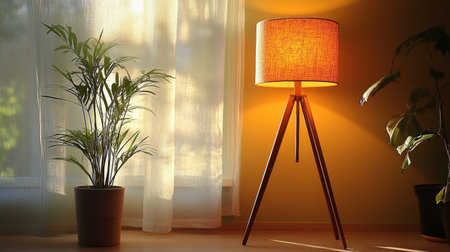 Warm light from a modern tripod lamp illuminates a cozy corner with potted plants and sheer curtains, creating a calming atmosphere in the room.