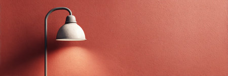 Industrial style lamp shedding a warm light downwards. Creating a focused beam on the textured terracotta colored wall. Providing a modern and minimalist interior design element with ample copy space