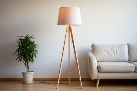 Lamp on wooden floor next to white wall and wooden floor. Generative AI.
