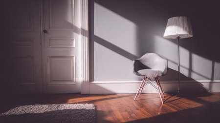 A serene interior composition featuring a modern chair bathed in soft light, casting intricate shadows across a wooden floor, creating a warm atmosphere.