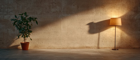 Minimalist interior with plant and lamp against textured wall.