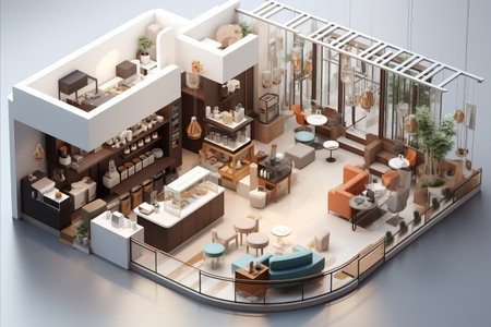Create an isometric illustration of a lively coffee shop with detailed elements and rich colors.