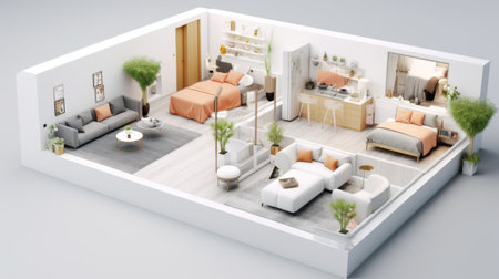 A 3D isometric visualization of a modern, minimalist apartment, showcasing a seamless integration of a comfortable living area and a functional home office. This clean and organized layout represents the future of urban living and remote work, emphasizing efficiency, style, and smart design in a compact space.