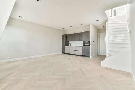 Corner of modern kitchen with white walls, wooden floor and white cabinets