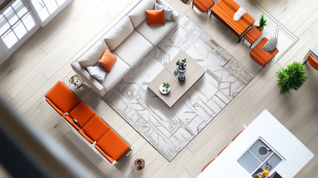 A stunning aerial view of a modern home interior showcases an open layout filled with natural light, cozy furnishings, and inviting decor, perfect for contemporary living.
