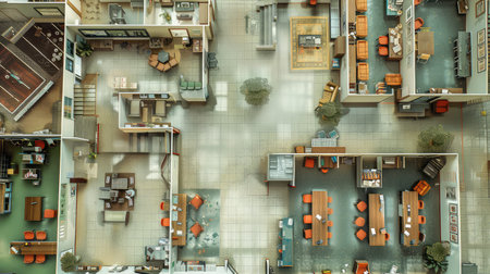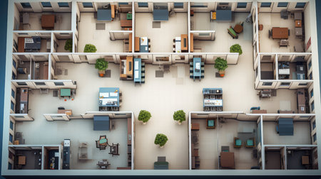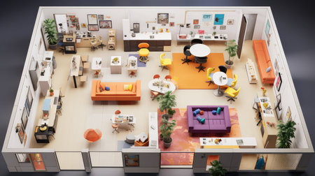 Top view on modern open space office with comfortable workplaces. Overhead view. By generative Ai