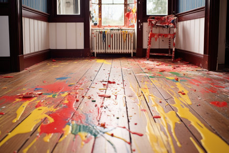 paint splatters on a wooden floor, created with generative ai