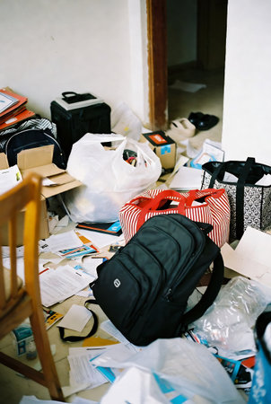 Messy office with a lot of papers and documents in bags.