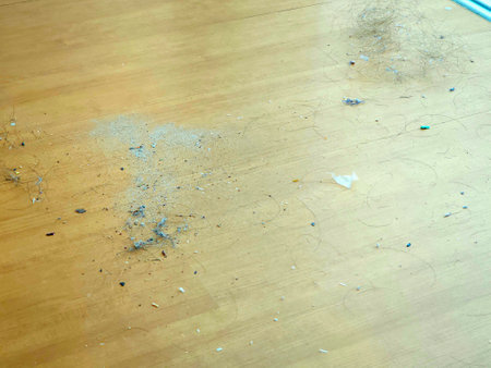 Crumbs scattered on wooden floor in morning light
