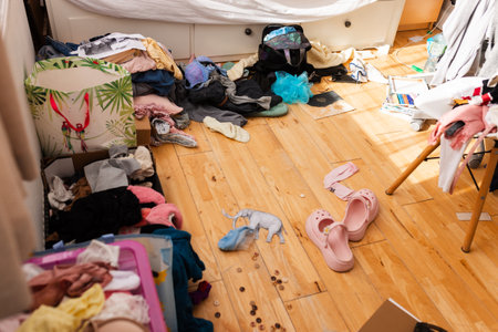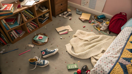 A cluttered teenage girl's room with clothes scattered on the floor, unmade bed, overflowing desk, and personal items left everywhere. The scene shows everyday teenage chaos with a mix of fashion, school supplies, and beauty products creating a typical untidy atmosphere.