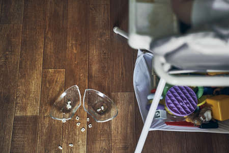 A baby on a high chair, dropped a cup of noodle soup on the wooden floor. The concept of accidents in the kitchen is dangerous for small children in the house. High quality photo