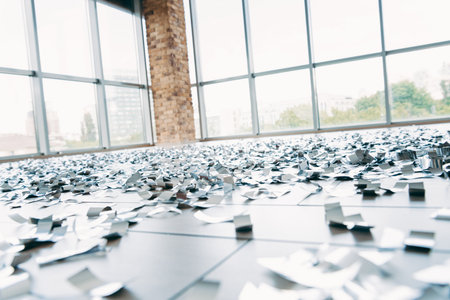 Modern office interior filled with scattered metallic paper pieces emphasizing creative energy and open workspace design