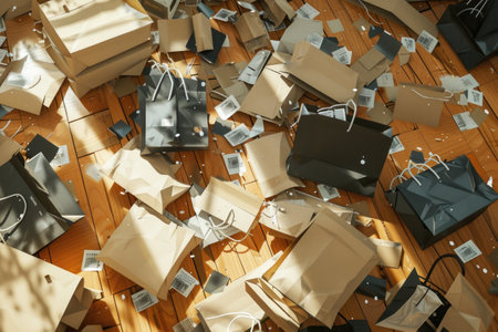 Black Friday Shopping Frenzy with Overflowing Bags and Sale Signs on Wooden Background AI