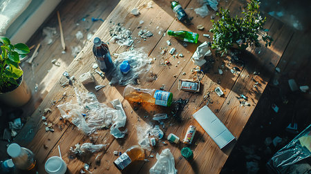 Generative AI Image of Scattered Trash Rubbish Garbage at Dirty Slum Wooden Table Home House
