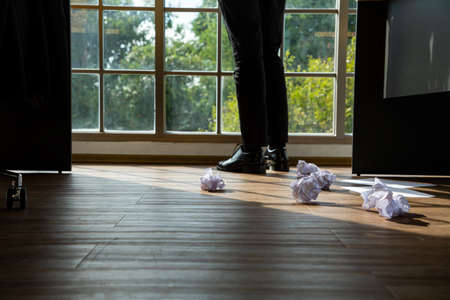 After can not think about project businessman looking outside for take a break for relax. Crumpled paper from boss after fail with his job and creative.Relax from task.