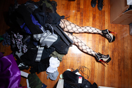 A large pile of assorted clothes lies on the floor in a cluttered room. Various garments are mixed together, while a pair of sneakers rests beside the clothes. Sunlight filters through an open door, enhancing the relaxed yet chaotic mood.