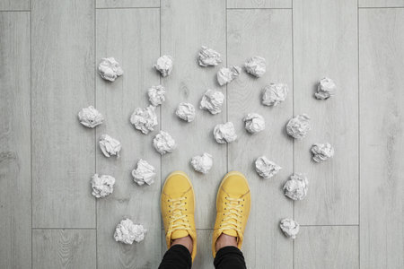 Closeup of person's feet surrounded by crumpled paper on floor, top view. Lack of ideas