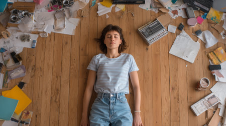 A young woman lies on a messy floor, surrounded by papers, feeling burnt out and lonely