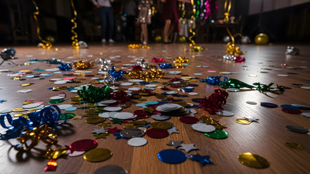 Colorful confetti and streamers are scattered across a wooden floor, indicating the aftermath of a lively celebration. In the blurred background, people can be seen dancing, capturing the energy of a party.