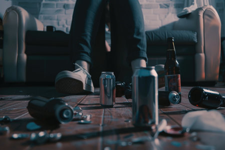 A pair of feet in sneakers and a pile of empty cans lay strewn on a wooden floor, the remnants of a night of revelry.