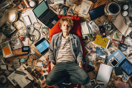 A top view of a Scandinavian teenage male lying on the floor with many electronic devices. Generative AI AIG30.