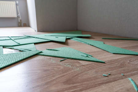 Laminate Underlayment Pieces Lying on Floor, DIY project Room Remodeling and Reconstruction - Selective Focus