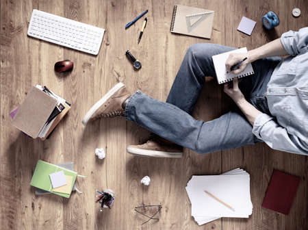 Man writing in notebook noting thinking idea solitions. Student man online larning. Creative inspiration study concept