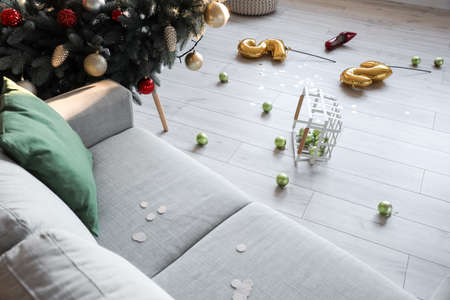 Interior of messy room after Christmas party
