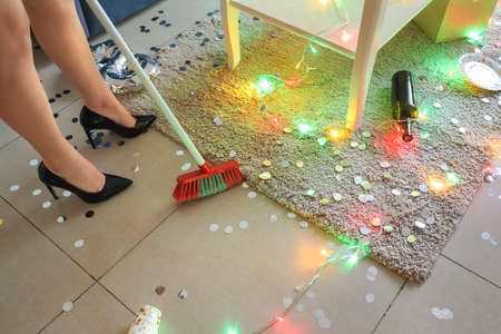 Woman with pushbroom cleaning mess of floor in room after party confetti, morning after party celebration, housework, cleaning service