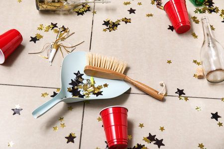 Brush and dustpan on messy floor after party, flat lay