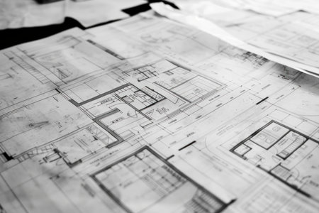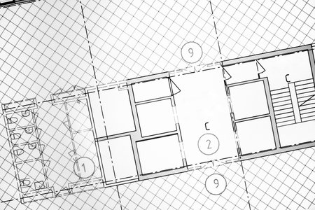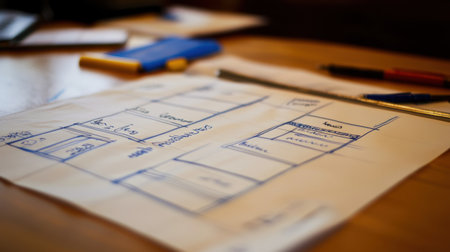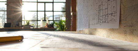 A close-up shot of a detailed floor plan drawing on a drafting table, with other tools and papers surrounding it. The drawing is of a buildings interior layout with several rooms and doors. The lighting in the image suggests a sunny day, casting shadows on the paper and surrounding items.