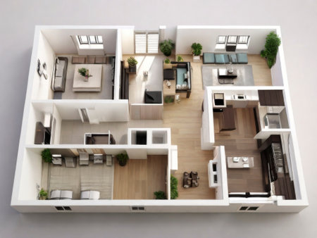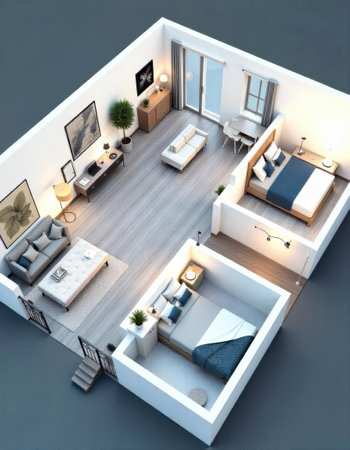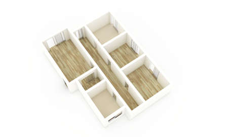 A detailed 3D illustration of a house floor plan, viewed from above, showcasing an intricate room layout, ideal for architecture and design themes.