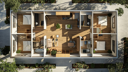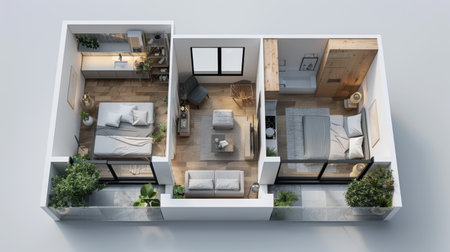 Top view of a modern apartment, 3d rendering. Computer digital drawing.