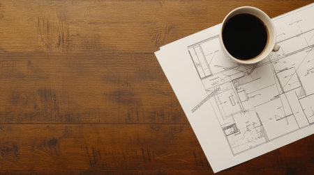 A flat lay of an architectural blueprint on a rustic wooden table, accompanied by creative tools and a steaming mug of coffee, perfect for design and planning inspiration.