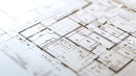 Blueprint-style background showing floor plans and measurements. Perfect for architecture presentations, engineering, and design sketches.