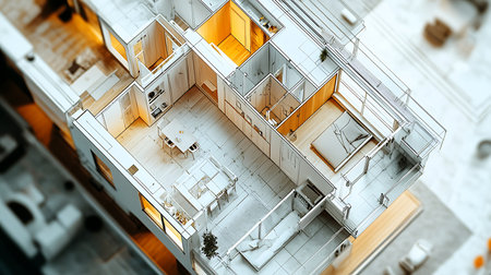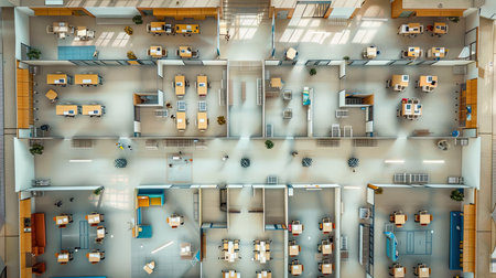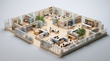 This picture showcases a realistic architectural plan scheme of a modern office building, highlighting its sleek design and contemporary features. cutaway